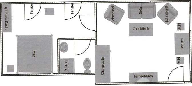 aus Wohnzimmer, Schlafzimmer und Duschbad mit WC.